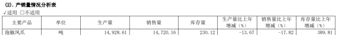 例如,受原材料成本上涨等因素影响,2018年有友食品对泡椒凤爪系列产品提价,致使2019年泡椒凤爪的销量大幅下滑20.97%,全年营收下滑8.44%。2022年至2023年,冻鸡爪等原材料价格上涨,公司对凤爪等产品进行提价,前述两年泡椒凤爪的吨价分别提升13.9%和12.3%,然而其销量却分别同比大幅下滑28.48%和17.82%,其中2023年公司泡椒凤爪销量仅为1.47万吨,创下自上市以来的销量新低。